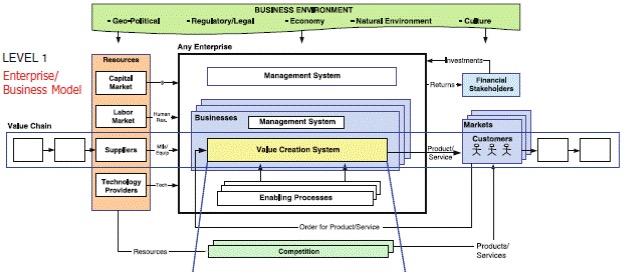 The business strategy will translate into strategic goals and objectives that will require organisational capabilities to achieve. Building and maintaining these capabilities is a combined effort of the process, organisational and resource strategies – therefore these must not just be aligned to the business strategy but also to each other. And of course this is not a waterfall process but a highly iterative one. The implementation of these strategies is packaged into a project portfolio and budgeted accordingly. Resource strategy in this case refers to all tangible and intangible resources required to run the processes and the organisation – a broad interpretation that pertains to the resource based view of the organisation.