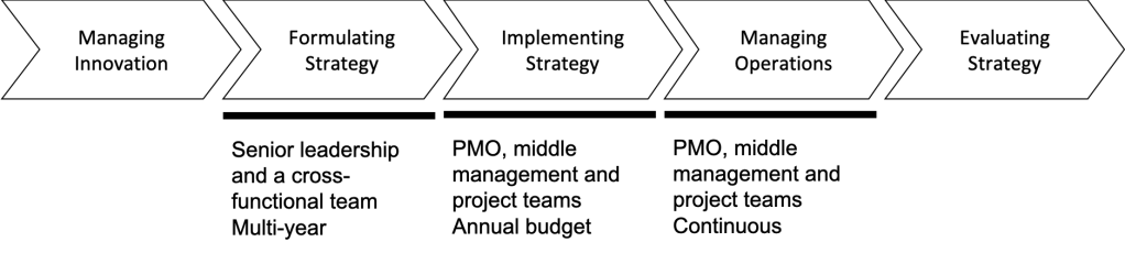 In the blogpost “Integrating the Management Process” we brought strategic and process management into a single management system under the accountability of senior leadership. The intent is have a cohesive system where strategy formulation clearly links to strategy implementation and to the management of operations. Here is a simple visualisation from that blog post: