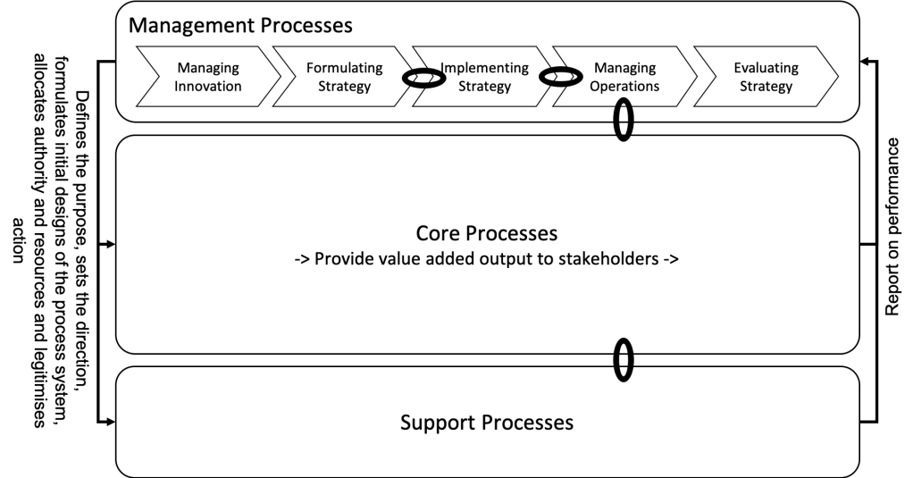The nature of the links between management and core or support processes that we need to establish, if we want to lead an organisation according to a defined strategy, are described on the left and right of the illustration. The question is how can we strengthen these links?