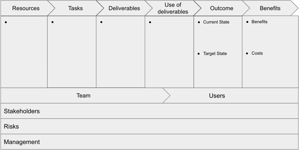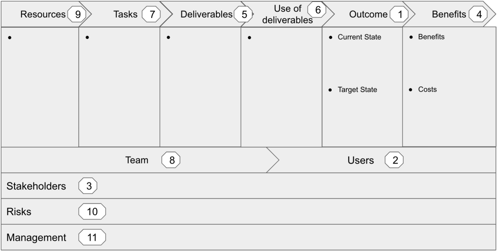 | Deliverables | Which products, services, learning and information does the project need to provide to the users so that they can reach the target state? In an agile project this will be the backlog. In a classical project it could be a separate definition of deliverables or you could use the work-breakdown structure. The deliverables describe the scope of the project. You can also add an out-of-scope section if this helps clarify the scope more clearly (but there is a risk here, that if you forget to exclude something, the customer can argue it must be in scope). |